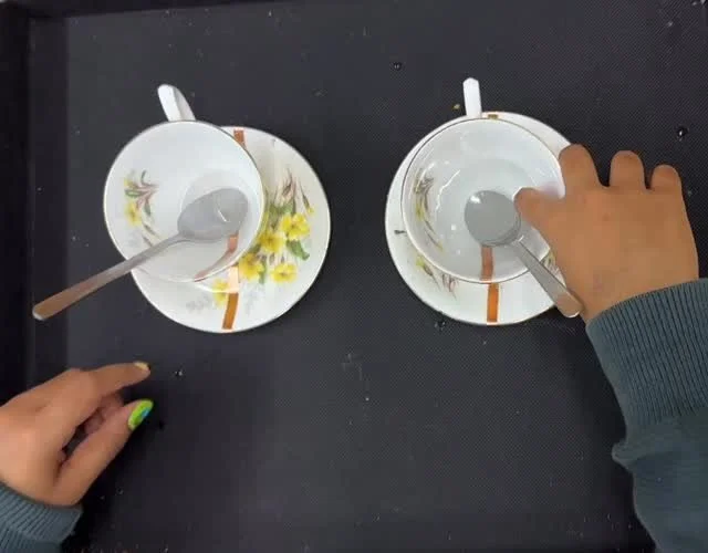 Video of a Tea spoon dancing in a tea cup on top of a tea chest